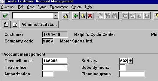 The Create customer screen is important and two items need to provided. The reconciliation account is the term used to designate the General Ledger account that is debited or credited for transactions involving customer 1350-00 which are also recorded in the A/R subsidiary ledger. The detail about customer transactions are kept in the subsidiary records and only the amounts are posted to the reconciliation account. The account number in this box is important because goods shipped to this customer will be automatically debited to this account. No separate accounting entry is made to cover the transaction. The sort key designates how customer data will be displayed.