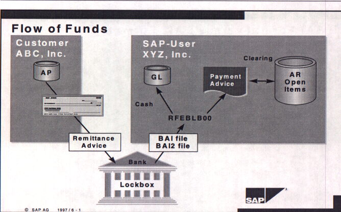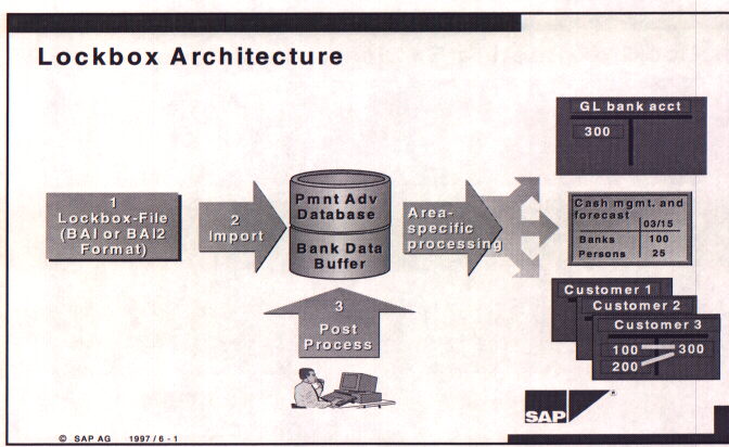 The basic operation of a lockbox system is fundamental to large businesses but is almost transparent to those without some knowledge of corporate treasury operations. The objective of a lockbox operation is to have the customer remit a payment check to a local post office box to minimize mail transit time. The checks are processed by the bank on a daily basis and the funds collected are usable by the receiving business much quicker than with the traditional process. The illustration below shows the basic operation of the lockbox and how SAP fits in.