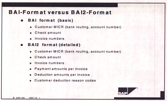 The bank sends XYZ, Inc. a detail data file of the checks posted to its account along with a daily total. The data is transmitted using BAI or BAI2 format. The SAP lockbox program translates the file and posts to a GL cash account, creates payment advices that are matched against accounts receivable open items and clears those items.