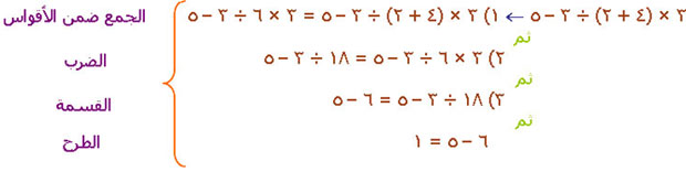 مثل : لتبسيط المقدار 3 × (4 + 2) ÷ 3 – 5 نتبع التسلسل التالي