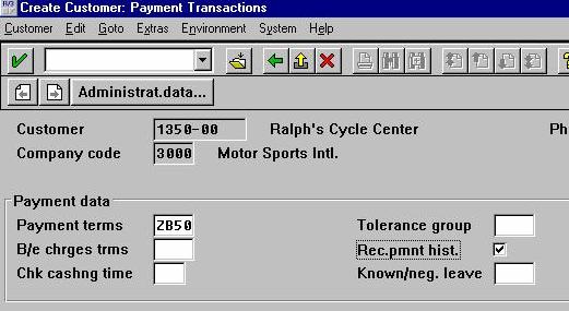 The next screen sets the payment terms. The drop down list in the box shows the possible entries. Make sure the Rec. pmnt hist box is checked. These items are critical for credit management and treasury management functions.