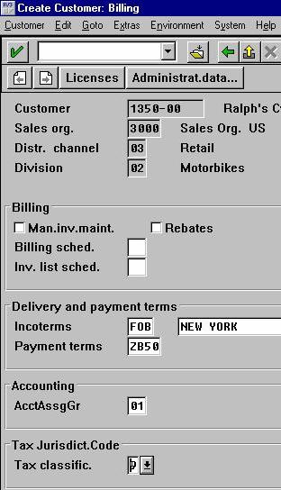 The next screen [not shown] requires the Tax Jurisdiction code and the trnasport zone that applies to the customer.