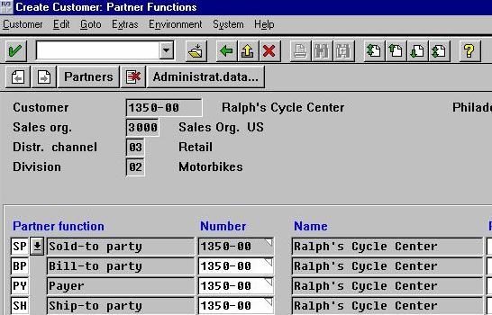 The partner Function screen will be filled out but will allow us to designate other business partners as the bill to part, the payer or the ship to party.