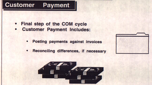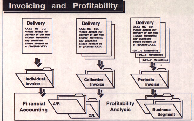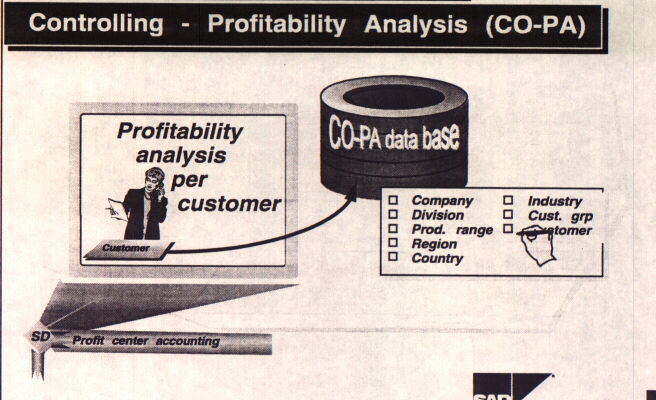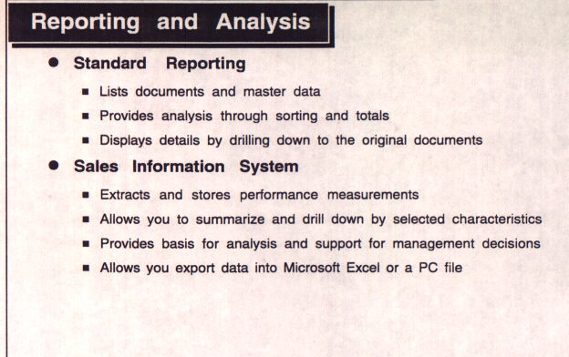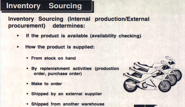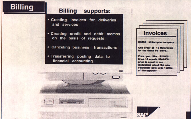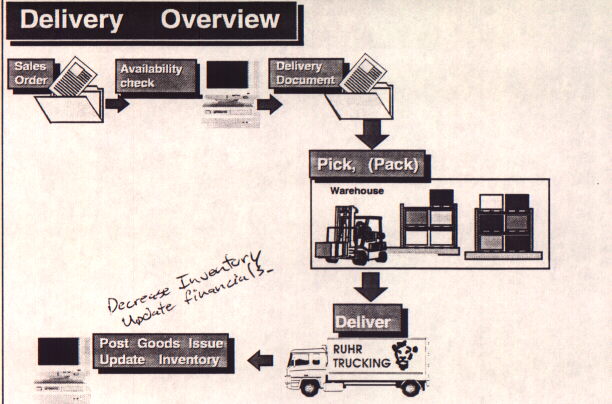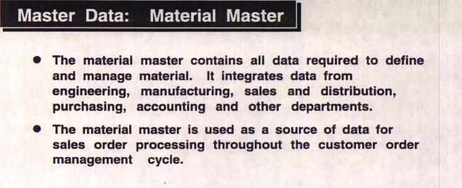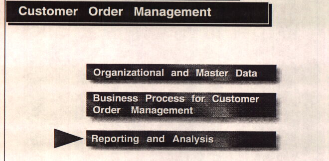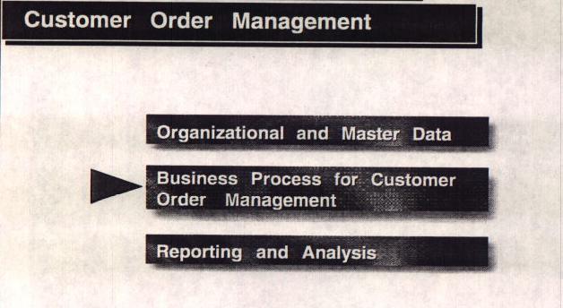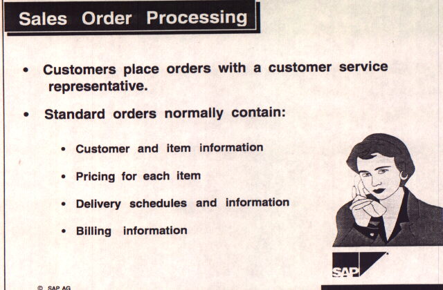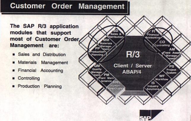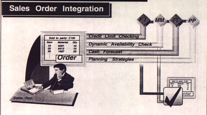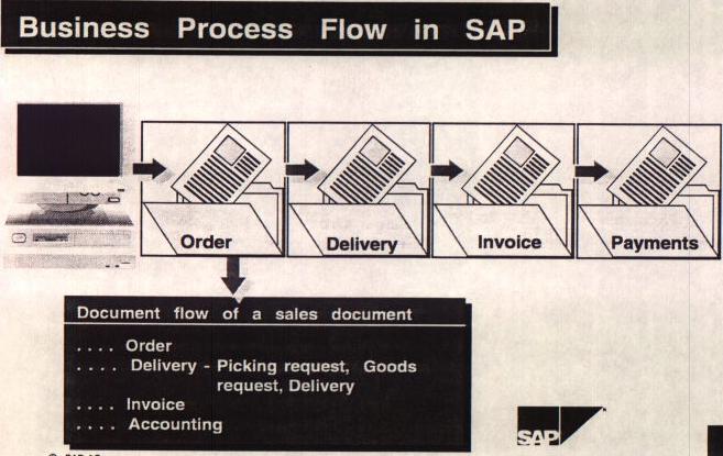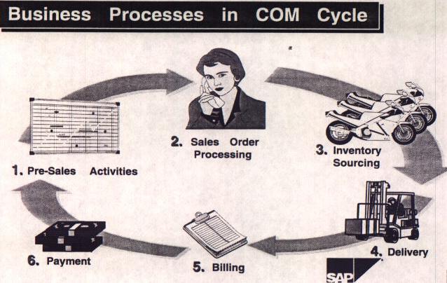 One of the key strengths of enterprise management systems is the integration of business functions. This process starts with the contact with a potential customer. This process of customer ordering is at the heart of the information system. The chart above shows the integration of sales and distribution to capture the order and ship the goods, material management to control the inventory, financial accounting to manage the billing and flow of cash, controlling to measure the profitability of operations and production planning to ensure an economical flow of goods to inventory and customers.