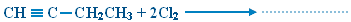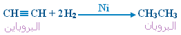 1. إضافة الهيدروجين H2 (الهدرجة أو الاختزال) : إضافة مولين من الهيدروجين بوجود عامل مساعد فلزي مثل البلاتين Pt أو النيكل Ni إلى الألكاين يؤدي إلى كسر الرابطة الثلاثية ويتحول الألكاين إلى الألكان المقابل، وتتوزع ذرات الهيدروجين الأربع على ذرتي كربون الرابطة الثلاثية بالتساوي. مثال :