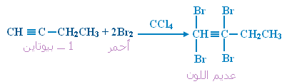 إضافة البروم الى البروباين يؤدي الى اختفاء لون البروم الأحمر ، وتكون مركب عضوي عديم اللون .