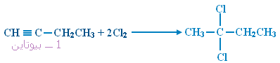 3- إضافة هاليد الهيدروجين HX : إضافة مولين من HX الى الألكاين يؤدي إلى كسر رابطتي π وتتبع الإضافة قاعدة ماركوفينيكوف حيث تتجه ذرتي الهيدروجين إلى ذرة الكربون الحاوية على أكبر عدد من ذرات الهيدروجين ، وتتجه ذرتي الى ذرة الكربون الأخرى. مثال :