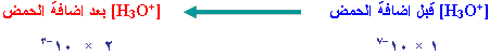 عند إضافة الحمض إلى الماء يزداد [H3O+] من 1 × 10-7 مول/لتر إلى 2 × 10-3