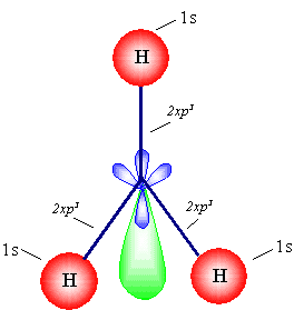 د- يحدث الترابط بين فلك I1s لكل ذرة من ذرات الهيدروجين الثلاث وثلاثة من أفلاك sp3 في ذرة النيتروجين , أما الفلك الرابع فلا يشترك في الربط ( لماذا ؟ ).