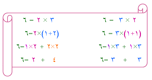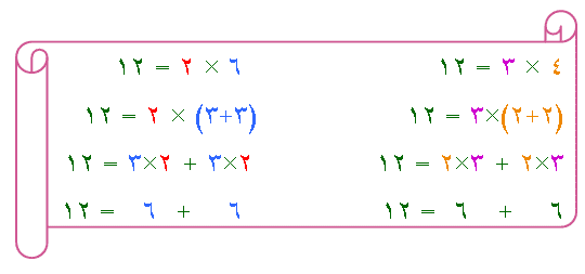 4×6 = (2×2) × 2×3 = 3 × (2×2×2) = (3× 2×2) × 2 ...... وهكذا ، ماذا نستنتج ؟ لنرى عند إجراء عملية الضرب ، ماذا يحدث إذا تم تفكيك أحد العوامل على صورة جمع . لنعود إلى العدد (12)