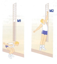 - stands side onto the wall, keeping both feet remaining on the ground, reaches up as high as possible with one hand and marks the wall with the tips of the fingers (M1)